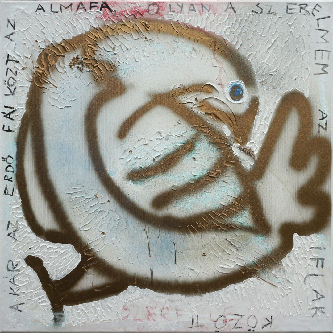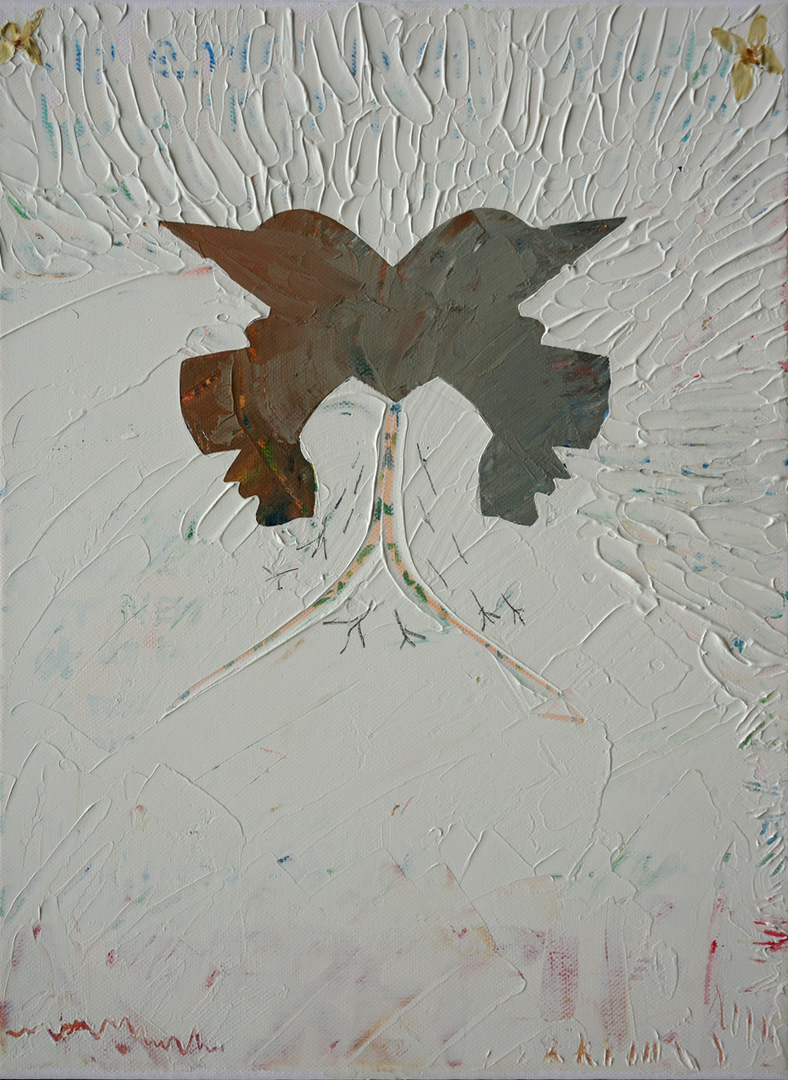 <strong>Taube</strong> (2017) | Spray, Strukturpaste und Blumen | 60 × 60 cm